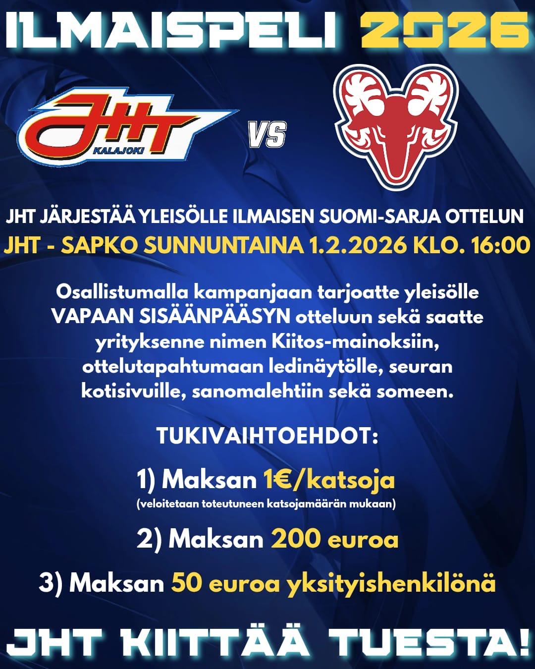 Ilmaispeli kampanja osallistujat tarjoaa yleisölle vapaa sisäänpääsy otteluun, sekä yritykset saa nimen kiitos-julkaisuihin, ottelutapahtumaan ledinäytölle, sanomalehteen ja someen.