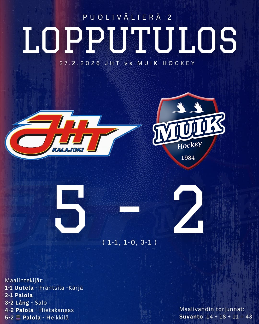 JHT taistelee tärkeän voiton pudotuspelien puolivälieräsarjan toisessa ottelussa. Muik Hockey kaatui Wiimax Areenalla lukemin 5–2 erät 1-1, 1-0, 3-1 Ottelusarja sai näin jatkoa vahvoille kotiesityksellä, jossa JHT osoitti tehokkuuttaan ja taistelutahtoaan alusta loppuun.